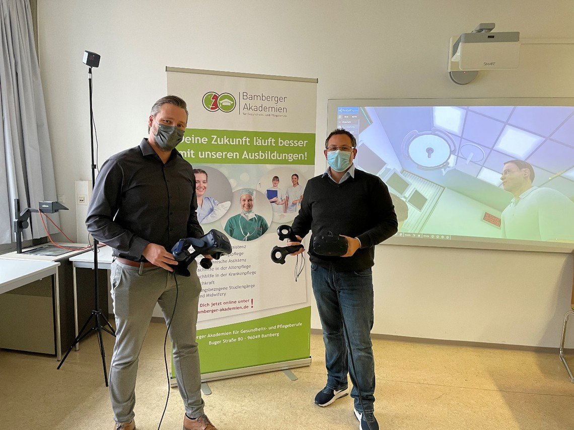 Ziel der Zusammenarbeit ist das Erstellen typischer und realistischer Ausbildungsszenarien der Pflege in VR auf Basis der bereits am Markt eingeführten Multi-User VR Lernumgebung i:medtasim aus dem Hause der TriCAT GmbH aus Ulm. Damit wird der bisher abgebildete Bereich von rettungsdienstlichen Einsatzszenen in den nächsten 24 Monaten um Inhalte aus dem Bereich der Pflege ergänzt. Diese werden nicht nur in enger Abstimmung mit den Lehrkräften aus Bamberg geplant und entwickelt, sondern anschließend auch in die Trainings im Skills Lab im Rahmen der Ausbildung integriert und evaluiert. Beide Partner haben sich vorgenommen, die gewonnenen Erkenntnisse nicht nur in die eigenen Arbeitsabläufe zu integrieren, sondern auch anderen Ausbildungseinrichtungen und Ausbildungsbereichen über dementsprechende Veröffentlichungen und Vorträge zugänglich zu machen. „Was mittlerweile an medizinischen Simulationszentren und Berufsfachschulen des Rettungsdienstes nicht nur in Deutschland zum Einsatz kommt, wird nun auch dem Bereich der Pflege zugänglich gemacht“, stellt Markus Neuberger, Geschäftsfeldleiter Medizin / Healthcare der TriCAT GmbH fest. Am 10.12.2020 wurde die Software offiziell an die Bamberger Akademien übergeben und eingerichtet. Nun werden nach und nach die pflegerischen Szenen entwickelt und integriert. „Wir freuen uns nicht nur über das gemeinsame Projekt, sondern auch auf die Reaktionen unserer Auszubildenden im Bereich Pflege, die schon bald allein oder zu zweit in die virtuelle Welt eintauchen und erste Erfahrungen sammeln können.“, betont Florian Strehl, zuständiger Mitarbeiter im VR Projekt auf Seiten der Bamberger Akademien.