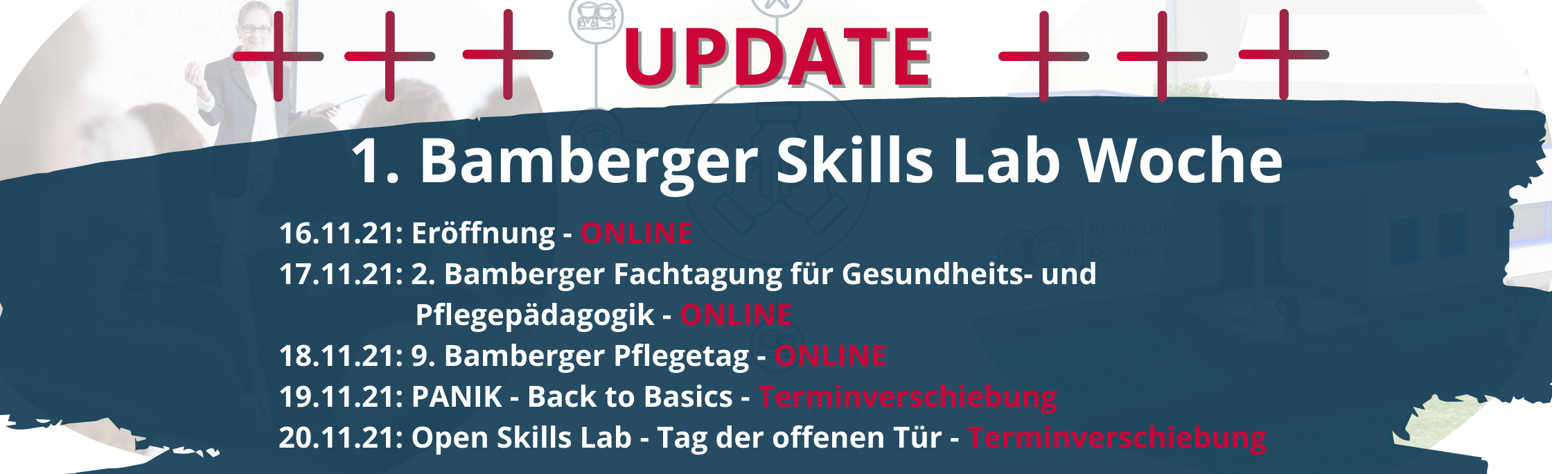 Durch die aktuellen Entwicklungen der Corona-Pandemie und die in Stadt und Landkreis Bamberg stark steigenden Infektionszahlen, werden wir die 1. Bamberger Skills Lab Woche zum Großteil auf Online-Formate umstellen.